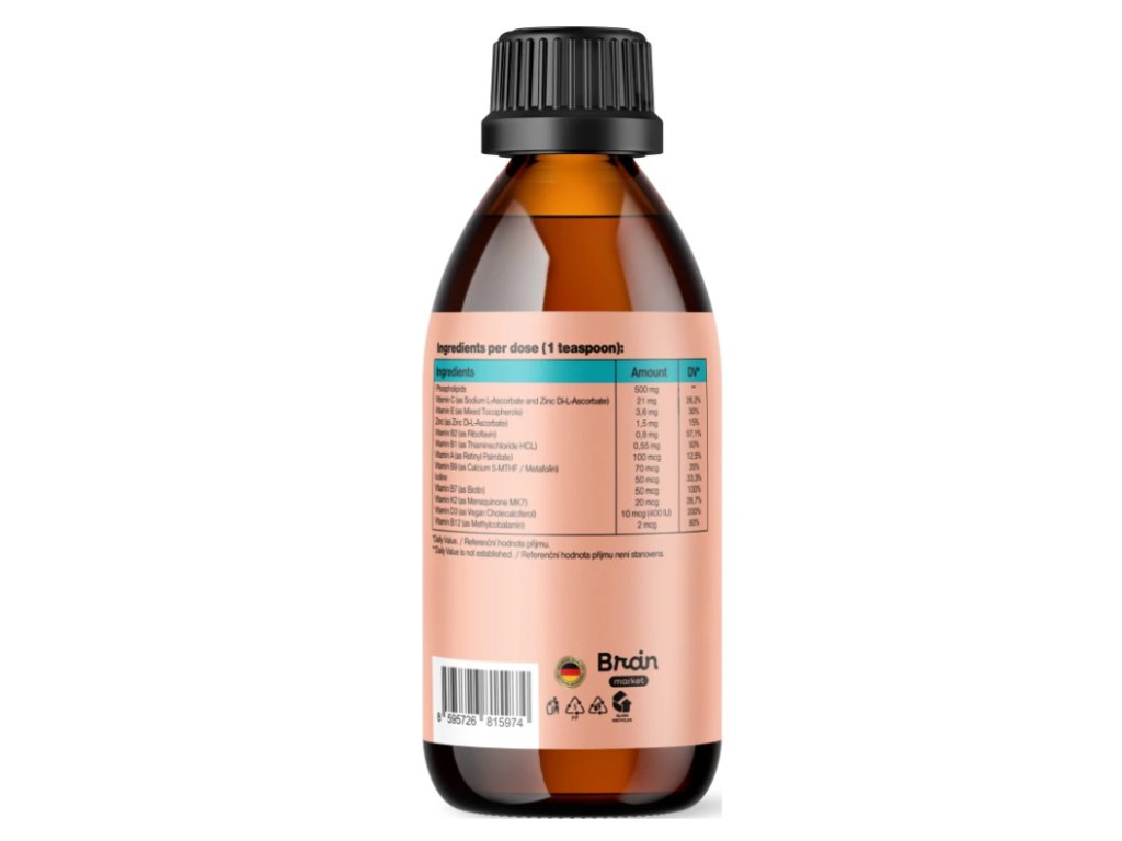 Složení: Voda, glycerol (přírodní stabilizátor), mango aroma, fosfolipidy (slunečnicový lecithin) (500 mg, RHP **), Vitamin C (jako Sodium L-Ascorbate a Zinc Di-L-Ascorbate) (21 mg, RHP 26,2 %), Vitamin E (jako Mixed Tocopherols) (3,6 mg, RHP 30 %), Zinek (jako Zinc Di-L-Ascorbate) (1,5 mg, RHP 15 %), kyselina citronová monohydrát, Vitamin B2 (jako Riboflavin) (0,8 mg, RHP 57,1 %), Vitamin B1 (jako Thiaminechloride HCL) (0,55 mg, RHP 50 %), Vitamin A (jako Retinyl Palmitate) (100 mcg, RHP 12,5 %), Vitamin B9 (jako Calcium 5-MTHF / Metafolin) (70 µg, RHP 35 %), Jód (jako Potassium Iodide) (50 µg, RHP 33,3 %), Vitamin B7 (jako Biotin) (50 µg, RHP 100 %), Vitamin K2 (jako Menaquinone MK7) (20 µg, RHP 26,7 %), Vitamin D3 (jako Vegan Cholecalciferol) (10 µg, RHP 200 %), extrakt z rozmarýnu (kyselina karnozová +), Vitamin B12 (jako Methylcobalamin) (2 µg, RHP 80 %).