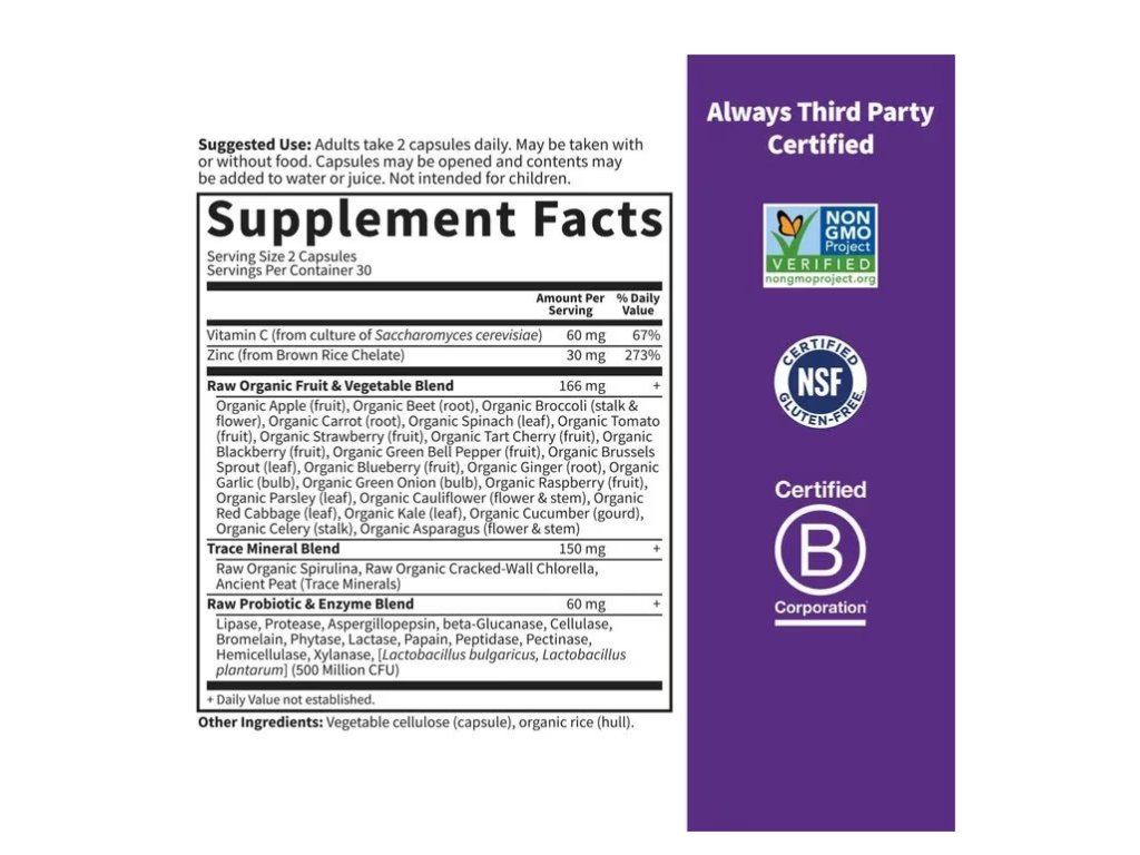 Vitamin Code Raw Zinc podporuje zdraví imunitního systému, zdraví kůže a očí, zdraví prostaty a obsahuje živá probiotika a enzymy pro podporu zdravého trávení. † Vitamin Code Raw Zinc, speciálně vyvinutý tak, aby poskytoval 30 mg vysoce účinného zinku (273 % denní hodnoty) plus 60 mg vitamínu C, je vyroben z 23 druhů práškového organicky pěstovaného ovoce a zeleniny a alkalizujících stopových minerálů. Raw znamená, že neobsahuje vysokou teplotu, syntetická pojiva nebo plnidla, umělá aromata, sladidla ani přísady běžně používané v tabletách.