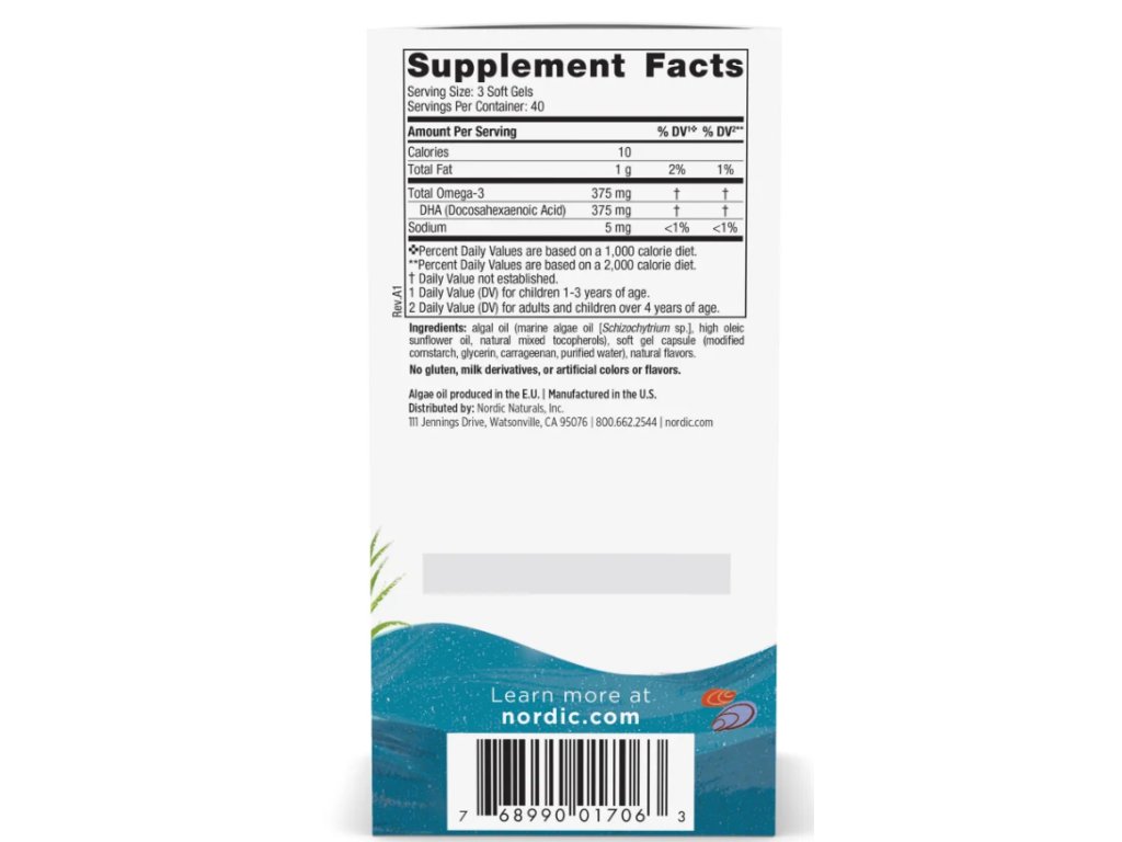 Řasový olej (olej z mořských řas [ Schizochytrium sp. ], slunečnicový olej s vysokým obsahem kyseliny olejové, přírodní směs tokoferolů), měkká gelová kapsle (modifikovaný kukuřičný škrob, glycerin, karagenan, čištěná voda), přírodní příchutě. Bez lepku, mléčných derivátů, umělých barviv a příchutí.