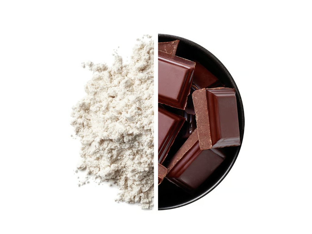 Bezlepkové ovesné vločky, izolát mléčných bílkovin, třtinový cukr, pohanková kaše, chia semínka (Salvia hispanica) 5 %, inulin, rýžová mouka, fruktóza, hořké čokoládové kousky 2,5 % (kakaová hmota, cukr, kakaové máslo, emulgátor slunečnicový lecitin), kakao, akáciová guma, aroma, chlorid sodný, protispékavé látky fosforečnan vápenatý a oxid křemičitý, menachinon-7 (vitamin K2), cholekalciferol (vitamin D). Může obsahovat stopy sóji.