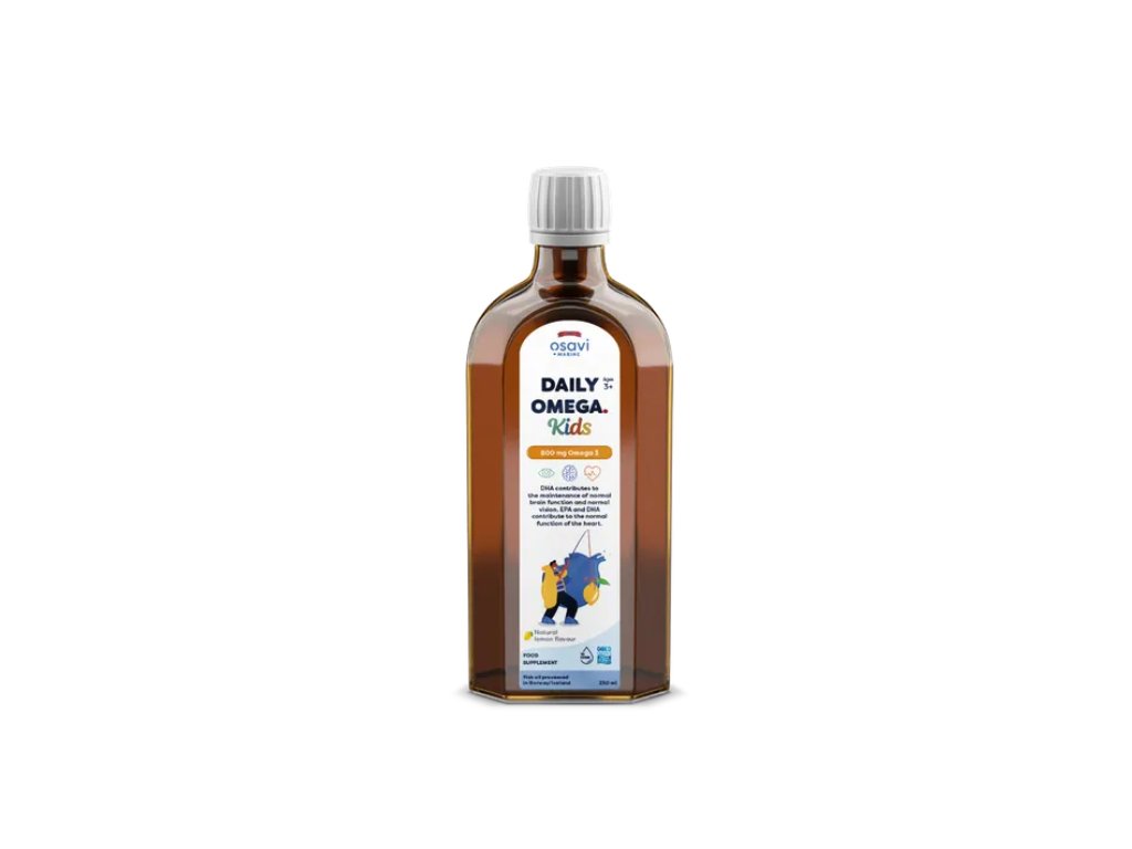 Správný vývoj dítěte závisí na výživě. Aby bylo zajištěno vše potřebné, strava by neměla postrádat omega-3 mastné kyseliny . Víme, že může být obtížné děti povzbudit k jídlu určitých potravin. Pokud se vaše dítě vyhýbá rybám bohatým na omega-3, zvažte doplnění stravy naším rybím olejem s příjemnou přírodní citronovou vůní . Daily Omega Kids obsahuje esenciální mastné kyseliny, které podporují vývoj mozku, srdce a zraku .