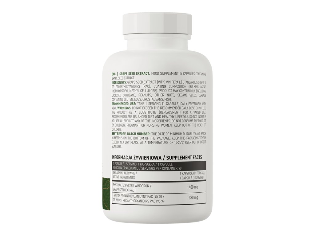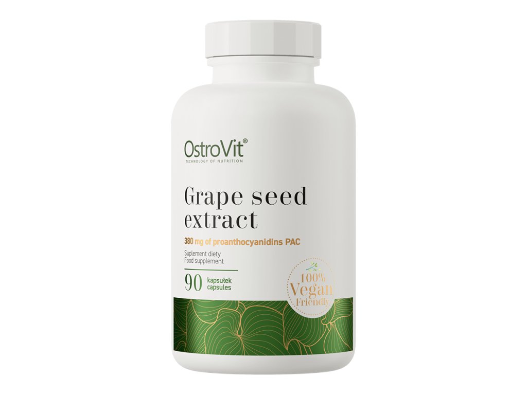 OstroVit Grape Seed Extract VEGE je doplněk stravy ve formě veganských kapslí, obsahující extrakt z hroznových jader (Vitis vinifera L.) standardizovaný na 95 % proanthokyanidinů (PAC), který zaručuje vysoký obsah zdraví prospěšných polyfenolů v každé porci. Tento produkt bude zajímat každého, kdo hledá doplněk, který je zdrojem antioxidantů. Antioxidační vlastnosti složek obsažených v doplňku můžete využít například po těžkém tréninku, který způsobuje tvorbu volných radikálů ve svalech, které mají negativní dopad na zdraví.