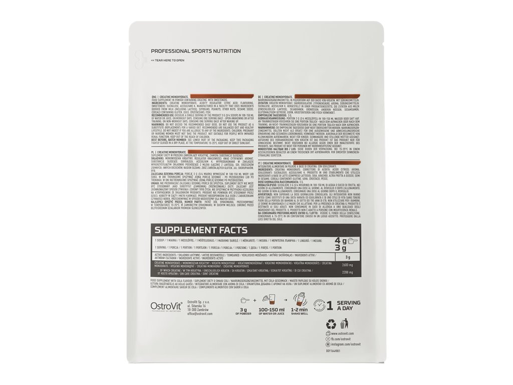 Kreatin monohydrát, regulátor kyselosti: kyselina citrónová; aroma, sladidla: sukralóza, acesulfam K. Doplněk stravy v prášku s obsahem kreatinu. Se sladidly. Výrobek může obsahovat mléko (včetně laktózy), sóju, arašídy, jiné ořechy, sezamová semínka, obiloviny obsahující lepek, vejce, korýše, ryby.