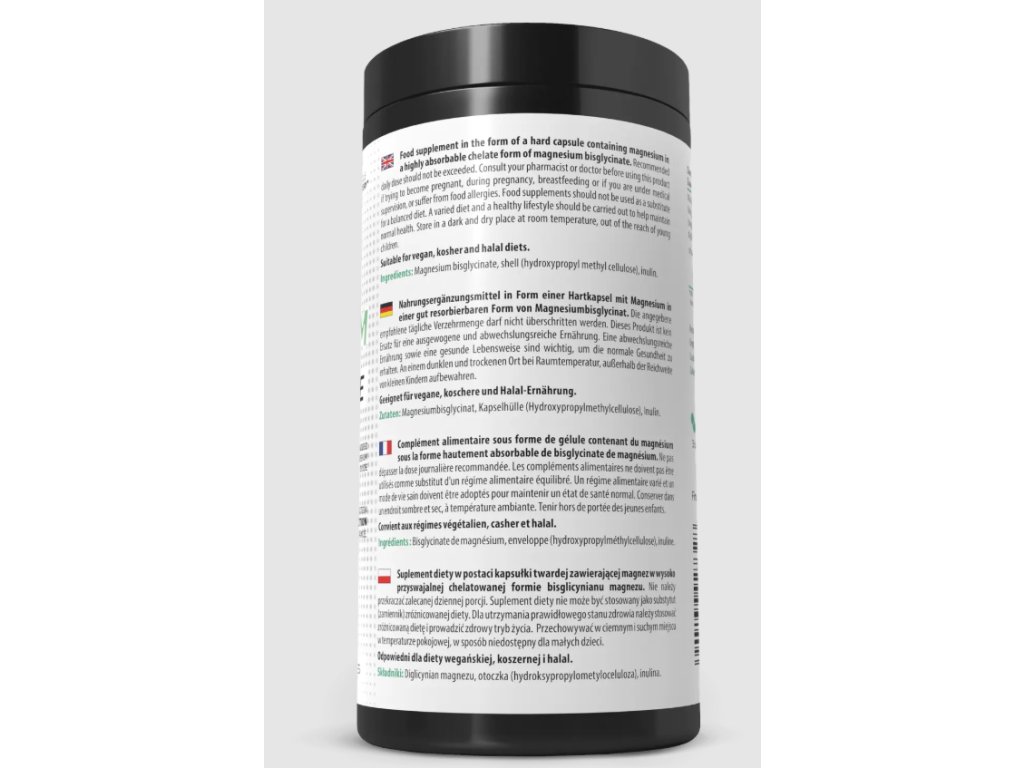 Bisglycinát hořečnatý poskytuje 375 mg hořčíku ve vysoce vstřebatelné chelátové formě. Nabízí vynikající biologickou dostupnost a je šetrný k trávicímu systému.